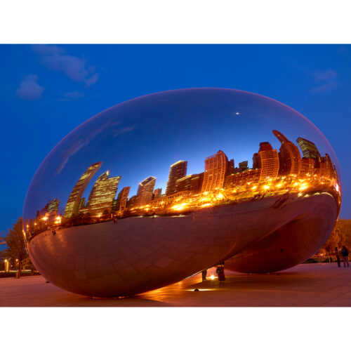 This is CLOUD GATE , a public sculpture by the renowned Indian born-British artist Anish Kapoor found in the AT & T Plaza, Millennium Park, Chicago.It is often referred to as The Bean.